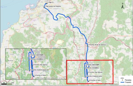 O itinerario comprende 9 paradas, das cales 6, nos polígonos industriais, son de nova creación. A relación de puntos de paso inclúe 2 en Vigo e 7 no Porriño por esta orde: Vigo estación intermodal, Vigo (praza de España), O Porriño (avenida de Galicia), O Porriño (Imprenta Paz), O Porriño (Vip Galicia), O Porriño (CTAG), O Porriño (GESTAMP), O Porriño (CEAMSA), O Porriño (Cableria Auto).