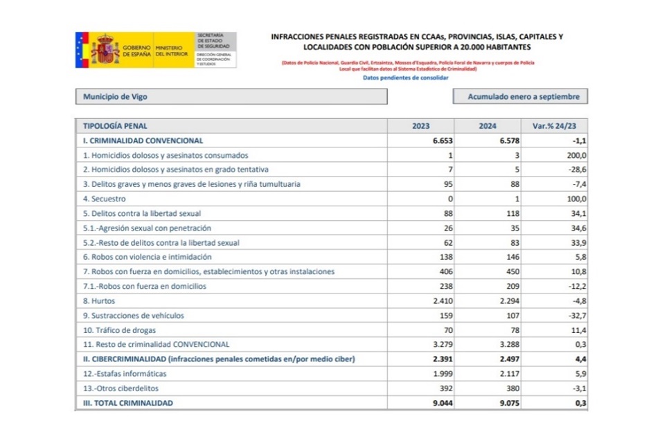 La criminalidad sigue subiendo tanto en Vigo como en Redondela, y el ejemplo lo tenemos en la comparación del período de enero a septiembre de 2024, y en comparación con igual período de 2023, donde sólo en la ciudad de Vigo los homicidios han subido un 200%, los delitos contra la libertad sexual se han incrementado un 34,10%, y dentro de los mismos las agresiones sexuales han experimentado un crecimiento de un 34,6% y el resto de los delitos contra la libertad sexual un 33,9%, los robos con violencia un 5,8%, los robos con fuerza en domicilios y establecimientos un 10,8%, y la cibercriminalidad sigue creciendo sin poder ponerle freno, al igual que el narcotráfico, una actividad delictiva que está detrás de la mayoría de los delitos graves del crimen organizado, como el terrorismo, corrupción, trata de seres humanos, tráfico de armas, homicidios y un largo etcétera.