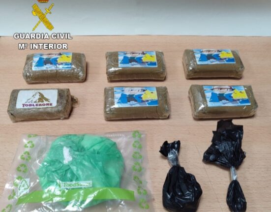 En total se intervienen 10 papelinas de cocaína con un peso aproximado de 5 gr. y 4 envoltorios de hachís con un peso de 6 gr.